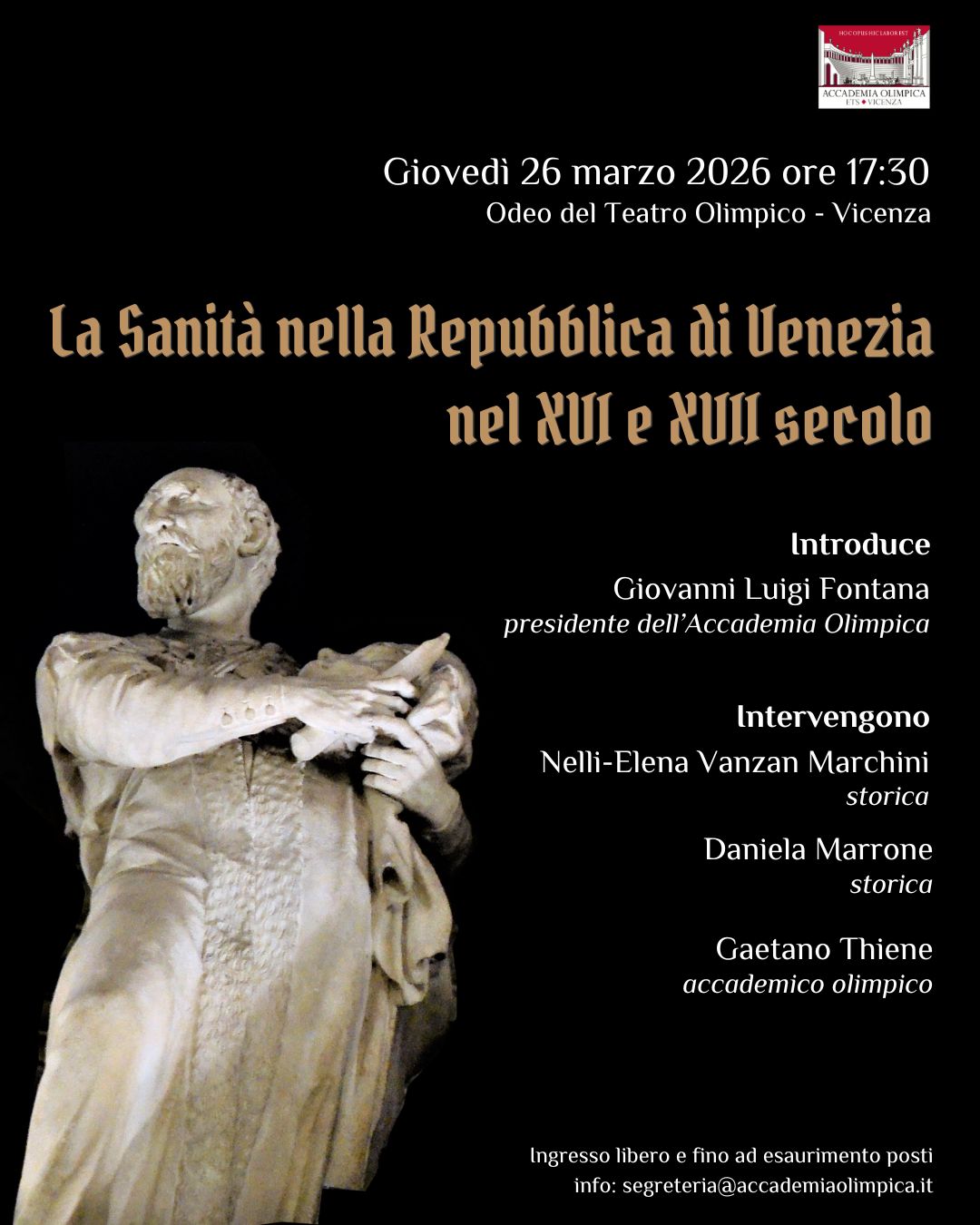 Giovedì 26 marzo alle 17.30, nell’Odeo del Teatro Olimpico, l’Accademia Olimpica propone una conferenza dal titolo La Sanità nella Repubblica di Venezia, un viaggio nel passato della gestione della salute pubblica guidato dalle storiche Nelli-Elena Vanzan Marchini e Daniela Marrone e dall’accademico olimpico Gaetano Thiene, professore emerito di Patologia cardiovascolare dell’Università di Padova.