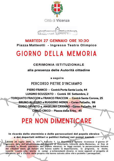 Nel Giorno della Memoria, lunedì 27 gennaio alle 10.30 si terrà un momento di riflessione in piazza Matteotti, all'ingresso del Teatro Olimpico, in prossimità della lapide in ricordo degli ebrei deportati da Vicenza ad Auschwitz, alla presenza del sindaco Giacomo Possamai e delle autorità cittadine.