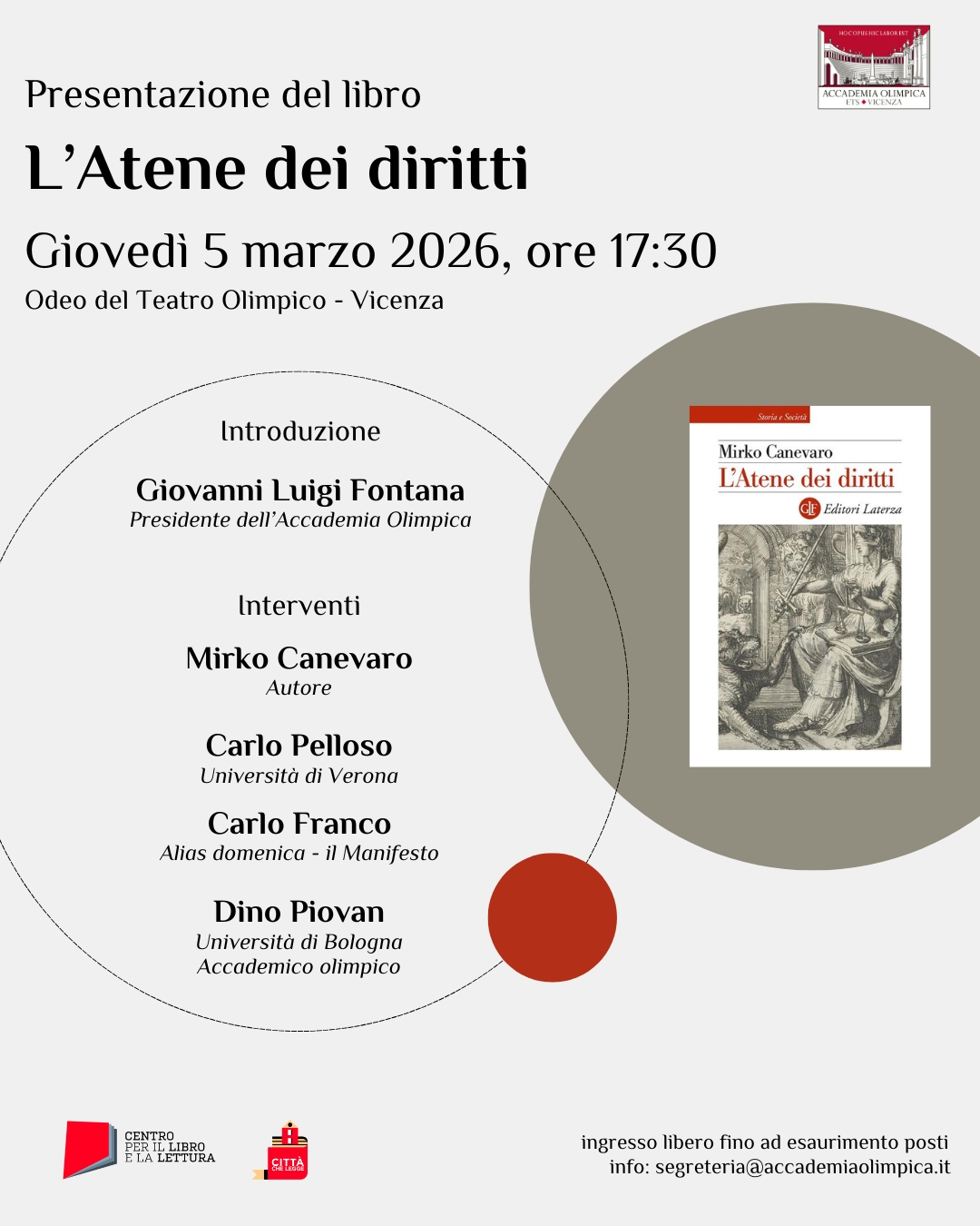 Ingresso libero fino a esaurimento dei posti disponibili. L’evento rientra anche nel programma di iniziative “Vicenza Città che Legge”, cui ha aderito il Comune di Vicenza. Per informazioni scrivere a segreteria@accademiaolimpica.it.