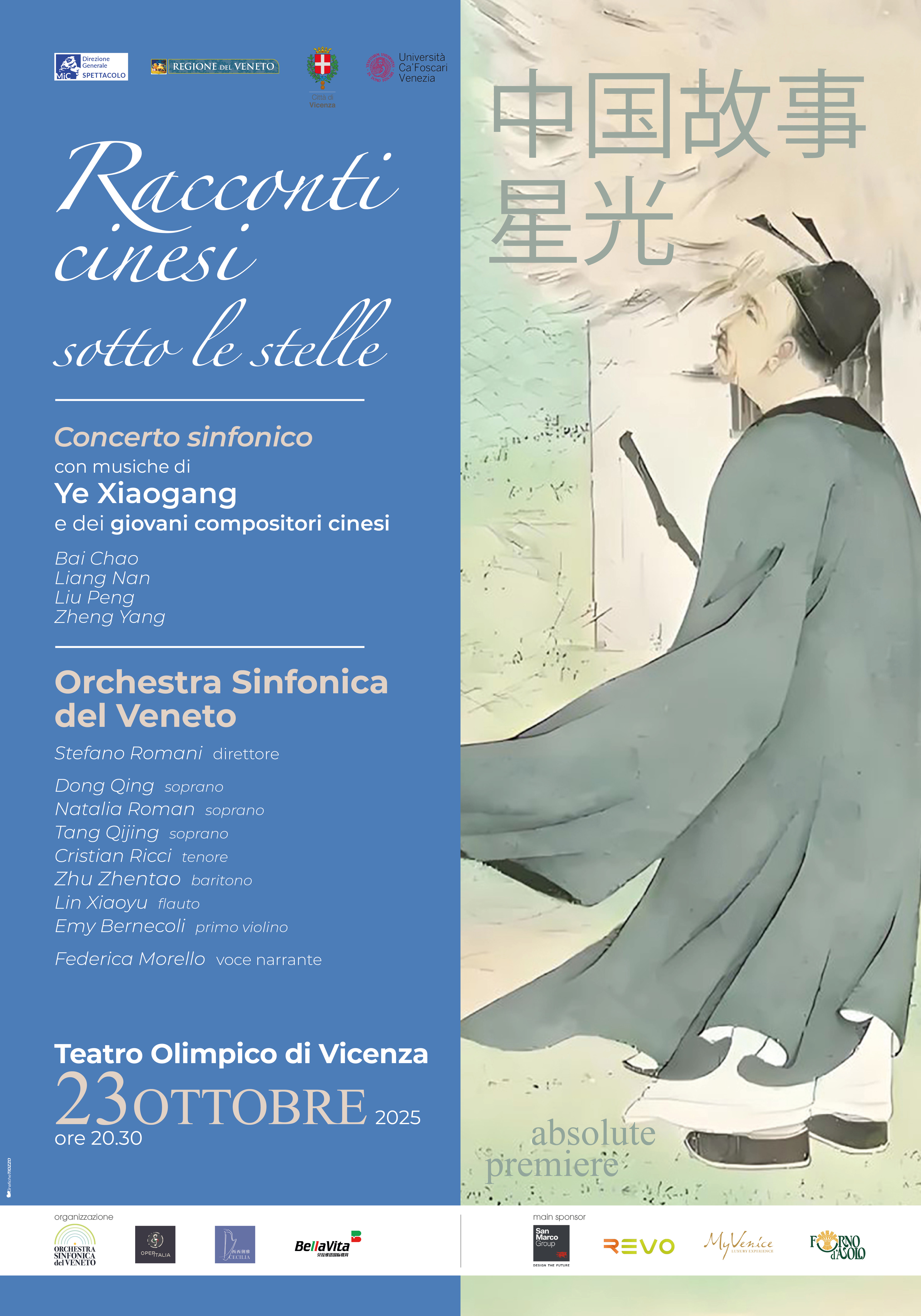L’Orchestra Sinfonica del Veneto in collaborazione con il Ministero della Cultura, il Comune di Vicenza, la Regione del Veneto e l’Università Ca’ Foscari di Venezia promuove in prima nazionale assoluta il concerto sinfonico “Racconti Cinesi – Sotto le Stelle” per presentare una selezione significativa della musica sinfonica contemporanea cinese attraverso le opere del grande compositore Ye Xiaogang, figura centrale della scena musicale della Repubblica Popolare Cinese e dei suoi quattro allievi Zheng Yang, Liang Nan, Bai Chao e Liu Peng.